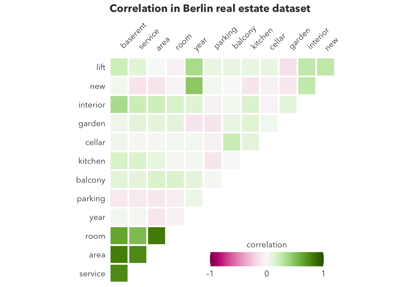 Let’s start with the correlations between each pair of features. The corrolegram shows very strong correlations between the base rent and other features, especially service, area, room, and interior.