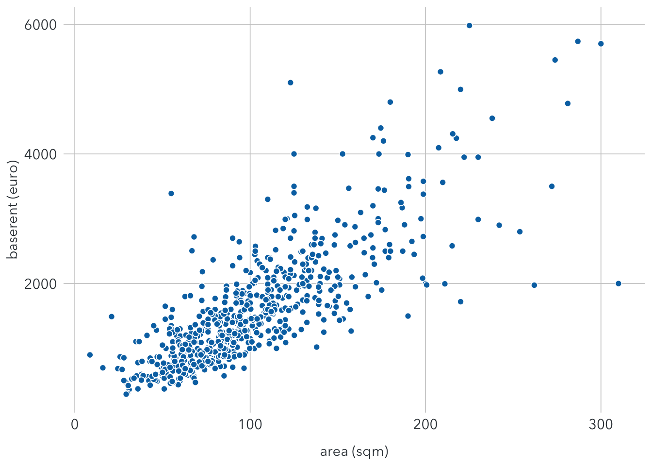 \(baserent = a + b*area + ε\), with ε is the error term, which includes other features that affect the base rent.