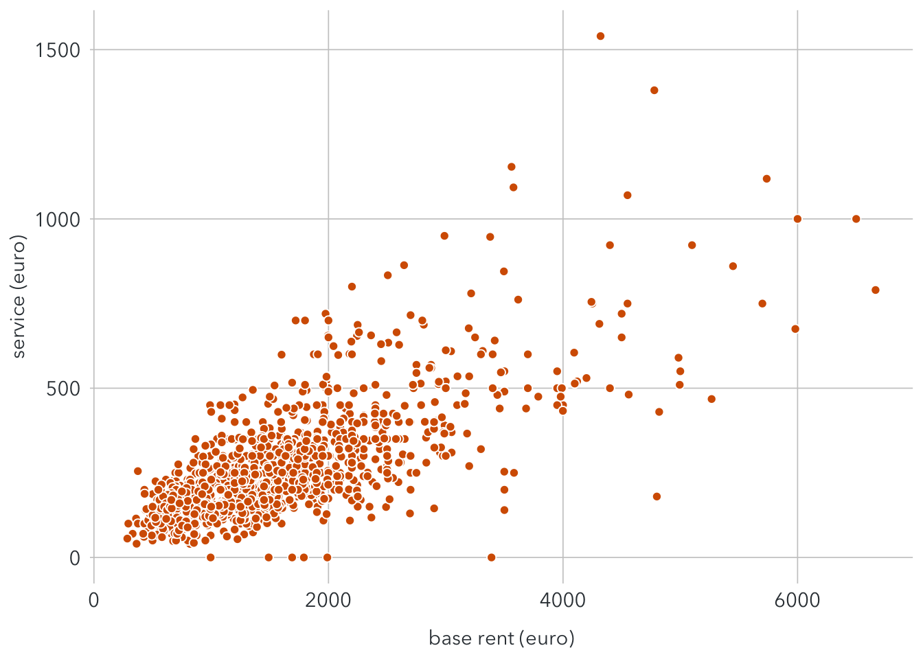 Here we can notice 5 outliers with the base rent price more than 10,000€ and 4 outliers with the service price more than 2,000€. These observations make it harder to figure out the overall pattern and may reduce the accuracy of the analysis as weell. We may discard them by setting thresholds: baserent < 10000 and service < 2,000.