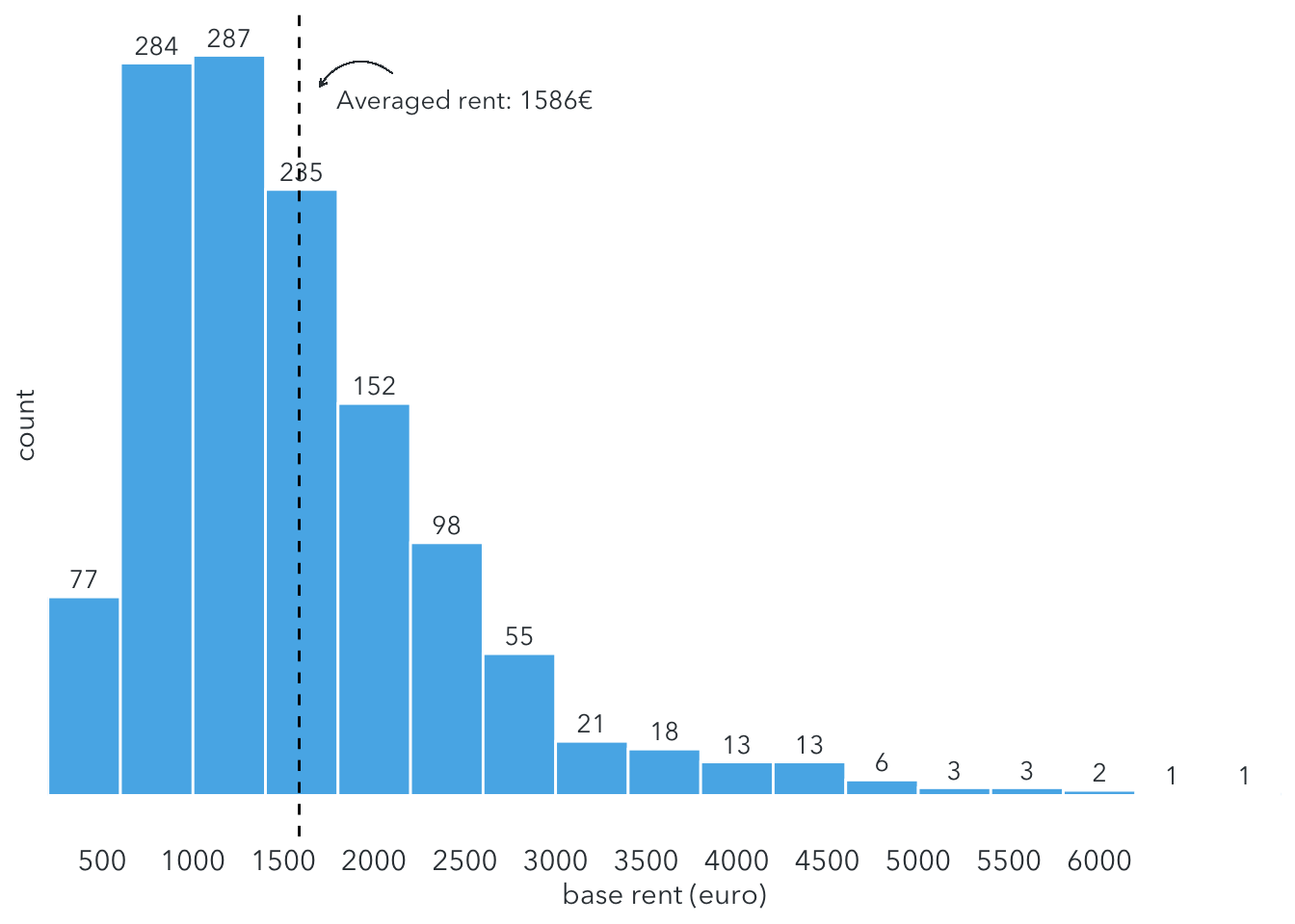 The histogram shows most people have to pay between 500 and 3000 €/month for rental properties in Berlin range. The averaged base rent is around 1986€/month.