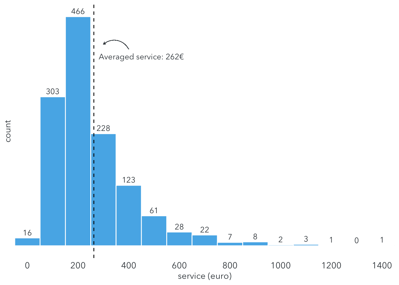 The service price mainly ranges between 100 and 400€/month with the average of around 260€/month.